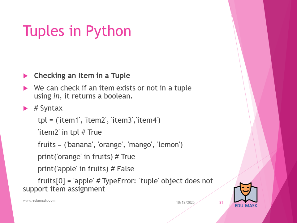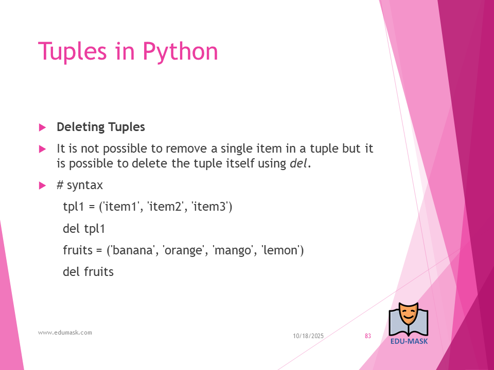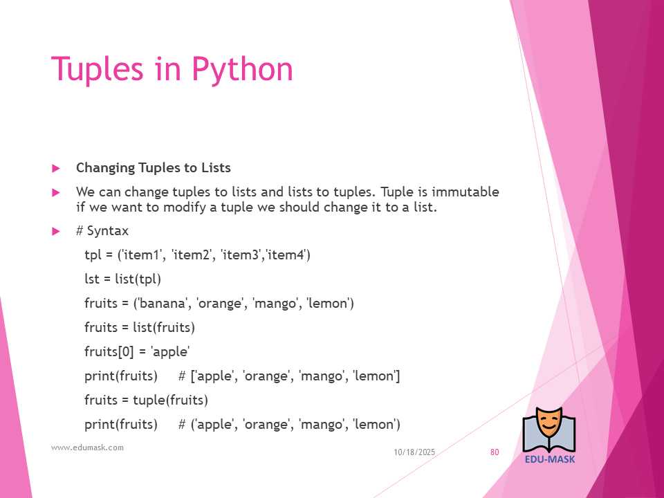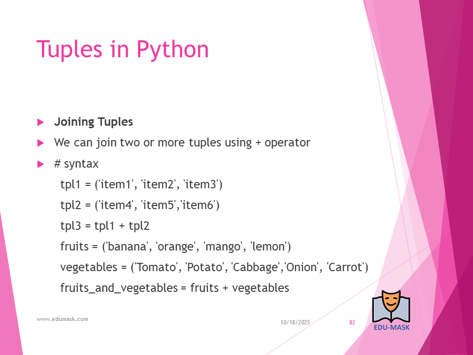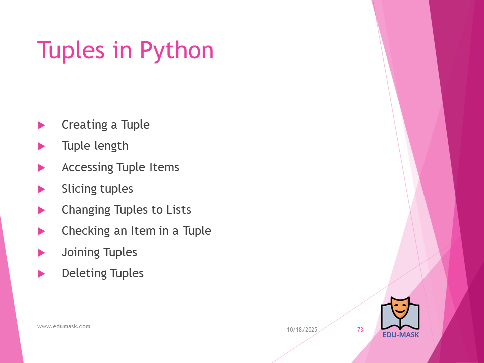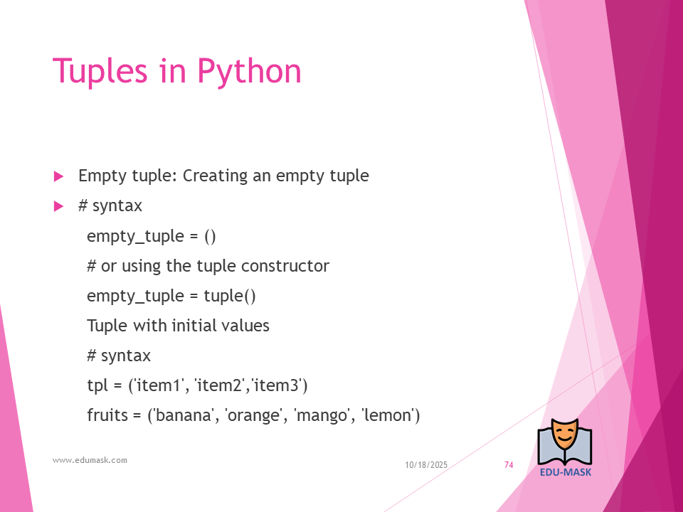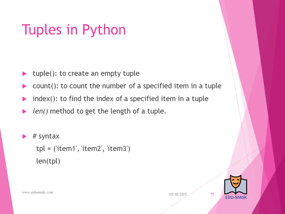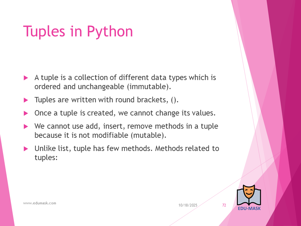 Tuple: is a collection which is ordered and unchangeable or unmodifiable(immutable). Allows duplicate members.