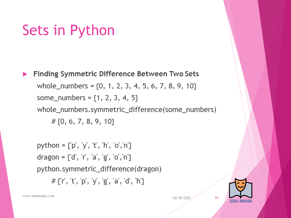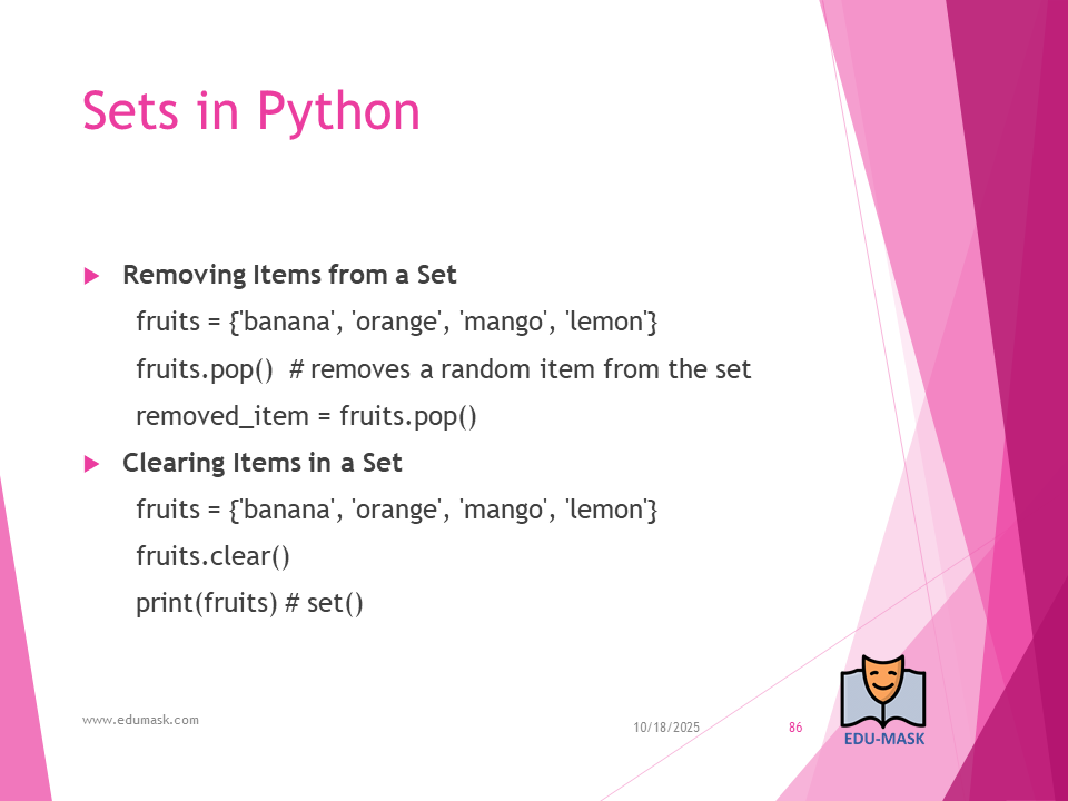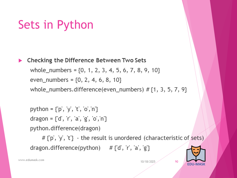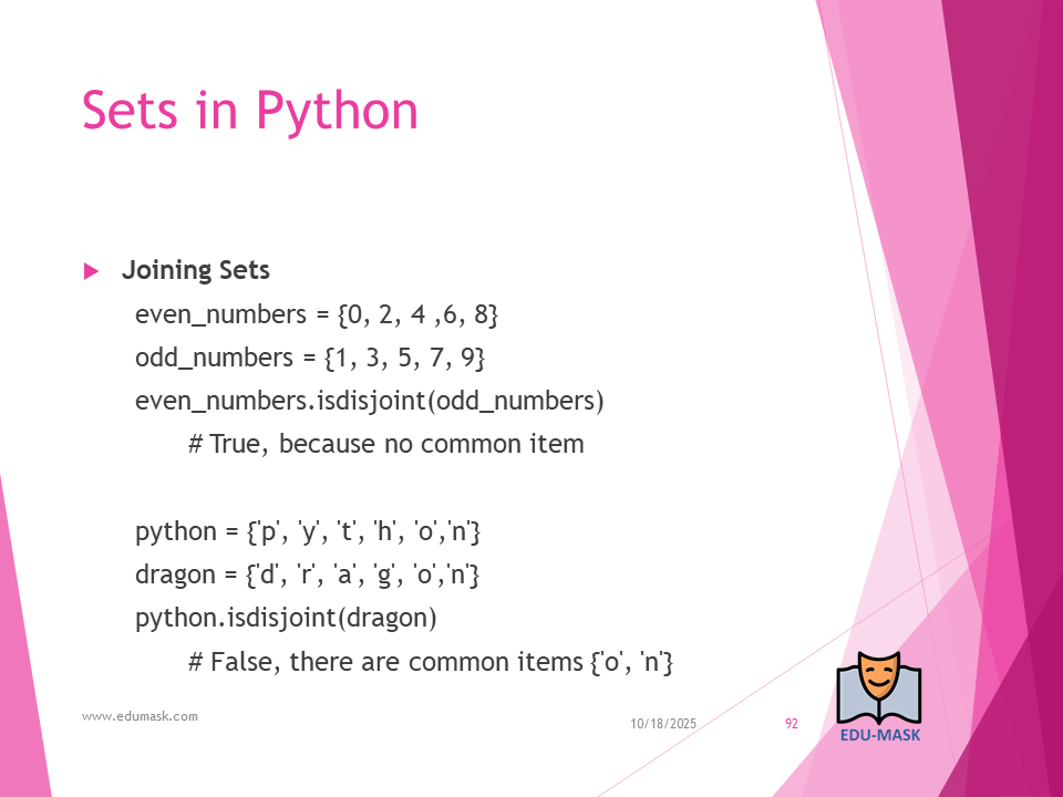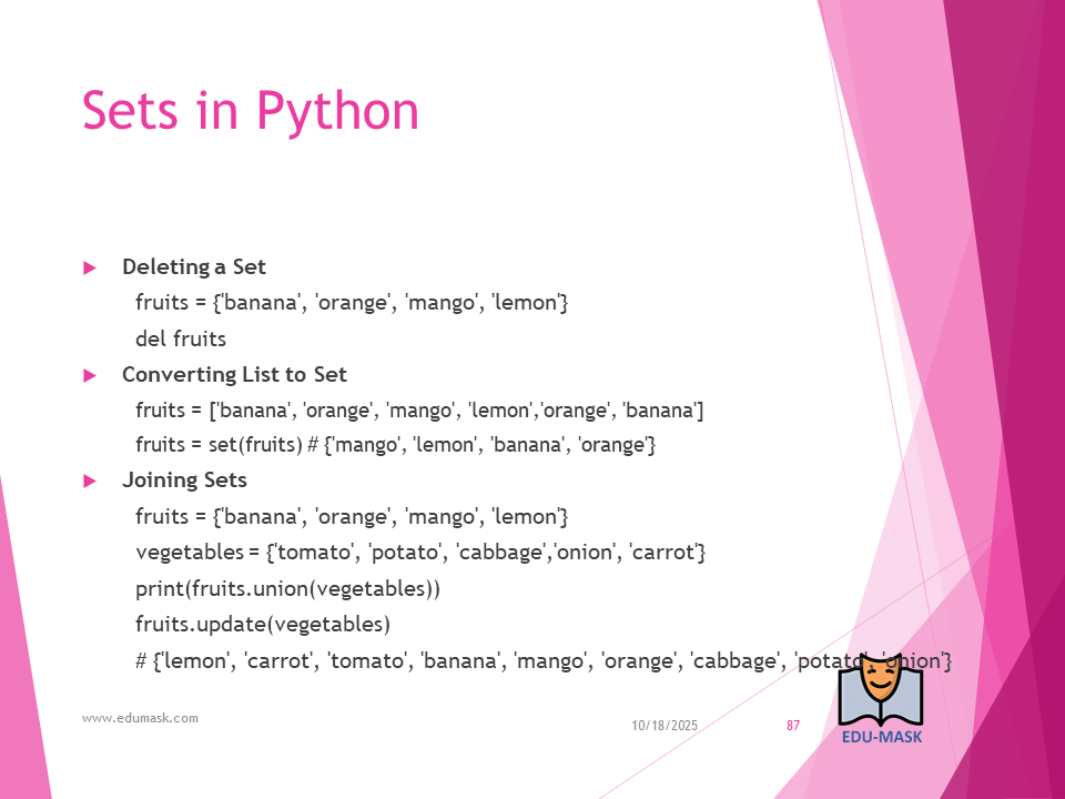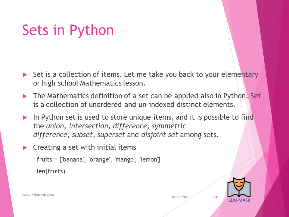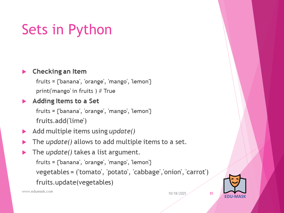 Set: is a collection which is unordered, un-indexed and unmodifiable, but we can add new items to the set. Duplicate members are not allowed.