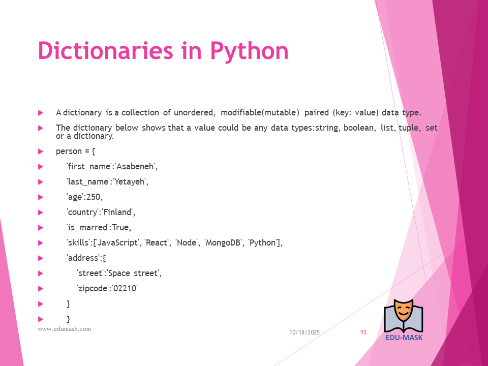 Dictionary: is a collection which is unordered, changeable(modifiable) and indexed.